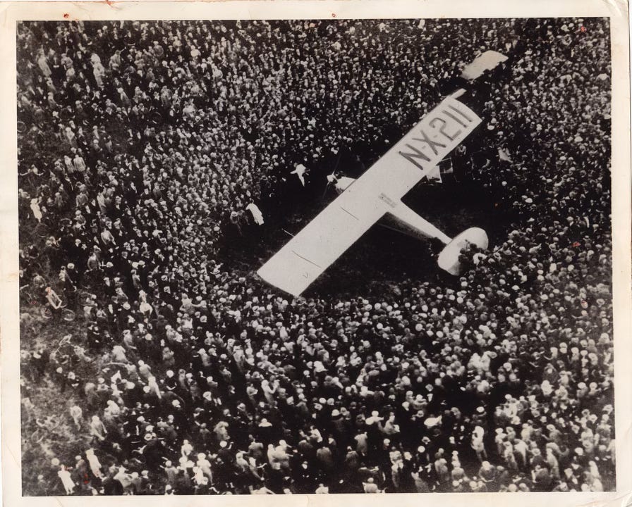 Watching people running toward him on the airfield, Lindbergh pondered his future. “At first he feared for his physical safety; over the next few months he worried about his soul,” Berg wrote. “He instinctively knew that submitting himself to the idolatry of the public could strip him of his very identity; and the only preventive he could see was to maintain his privacy.“