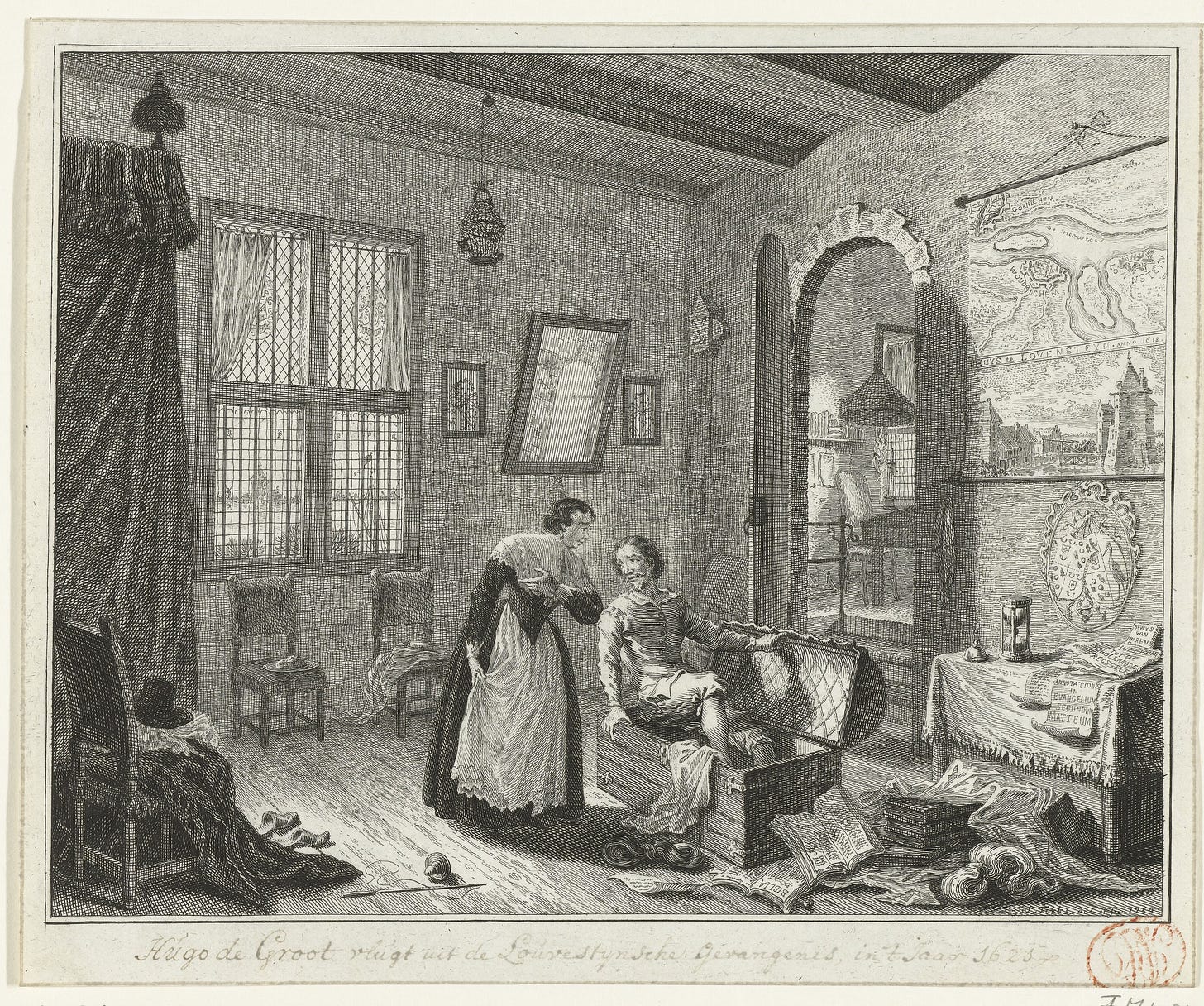 That was why Prince Maurice of Nassau imprisoned Grotius, then in his mid-30s, for life at Loevestein castle. The inmate’s clever wife Maria gained permission to move into the castle. As the vigilance of the guards gradually waned, Maria saw an opportunity. She told the wife of the warden that Hugo was sick from overwork and vowed to get rid of his borrowed books.